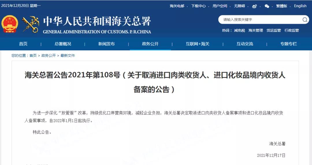 2021年12月17日,海關總署發布2021年第108號公告:為進一步深化“放管服”改革,持續優化口岸營商環境,減輕企業負擔,海關總署決定取消進口肉類收貨人備案事項和進口化妝品境內收貨人備案事項,自2022年1月1日起執行。