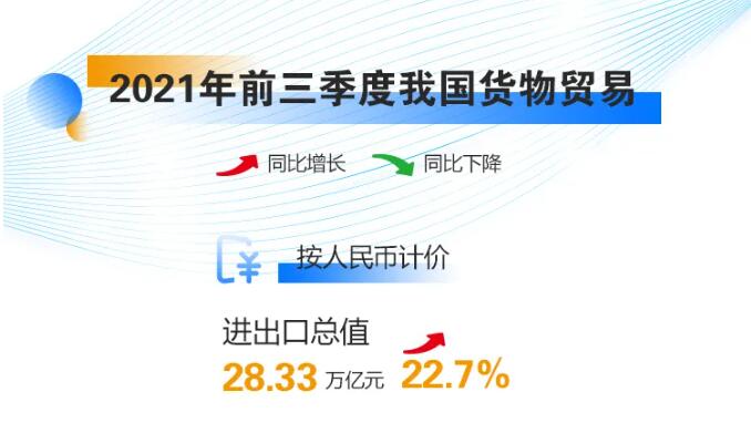 據(jù)海關(guān)統(tǒng)計(jì),前三季度,我國(guó)貨物貿(mào)易進(jìn)出口總值28.33萬(wàn)億元人民幣,比去年同期增長(zhǎng)22.7%。