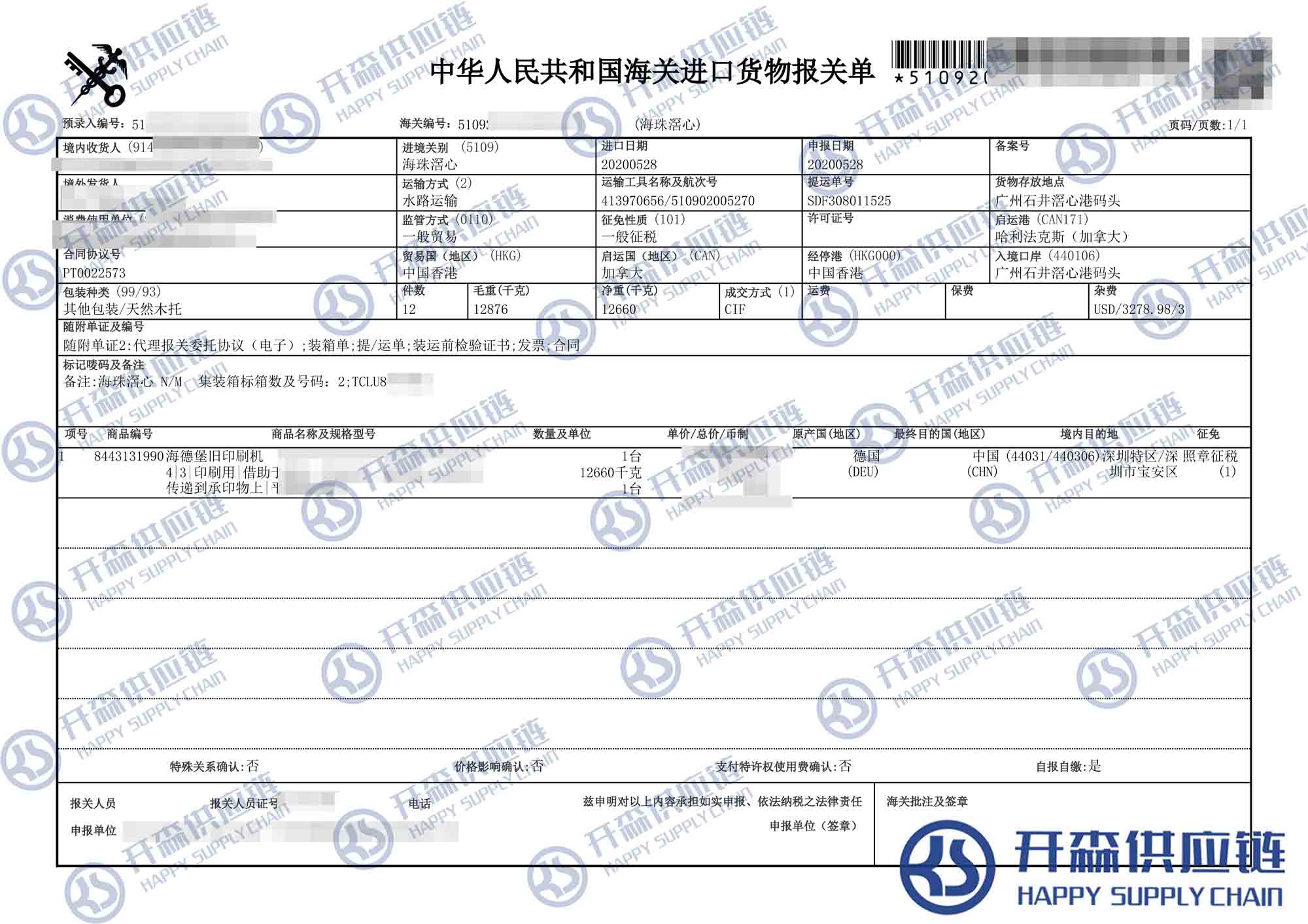開森進口供應鏈擁有豐富的二手舊海德堡印刷機進口報關操作經驗及案例,十余年操作經驗及案例可供參考,可按需定制進口方案,幫助客戶解決進口難題,快速進口清關到港到貨。