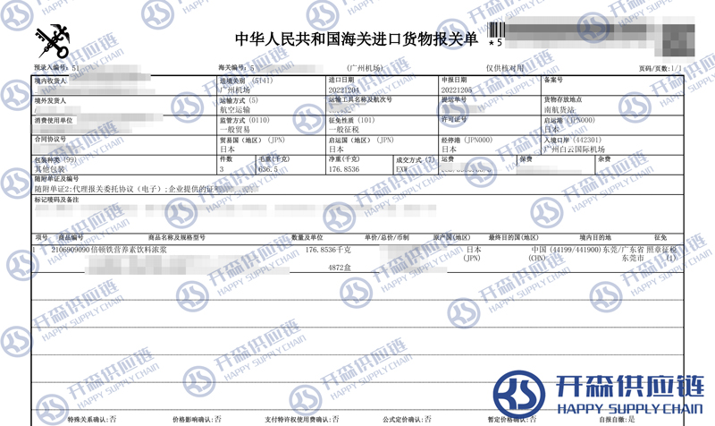 【本文結語】 上述就是廣州機場營養素飲料濃漿進口報關清關代理服務【經典案例】的全部內容,希望能對您有所幫助,如有飲料進口報關上任何疑問及問題可隨時在線聯系我們或撥打 18002611553,開森供應鏈擁有豐富的飲料進口報關操作經驗及案例,10余年進口經驗為您所用,各類進口疑難都能為您一一解答及協助快速處理解決!